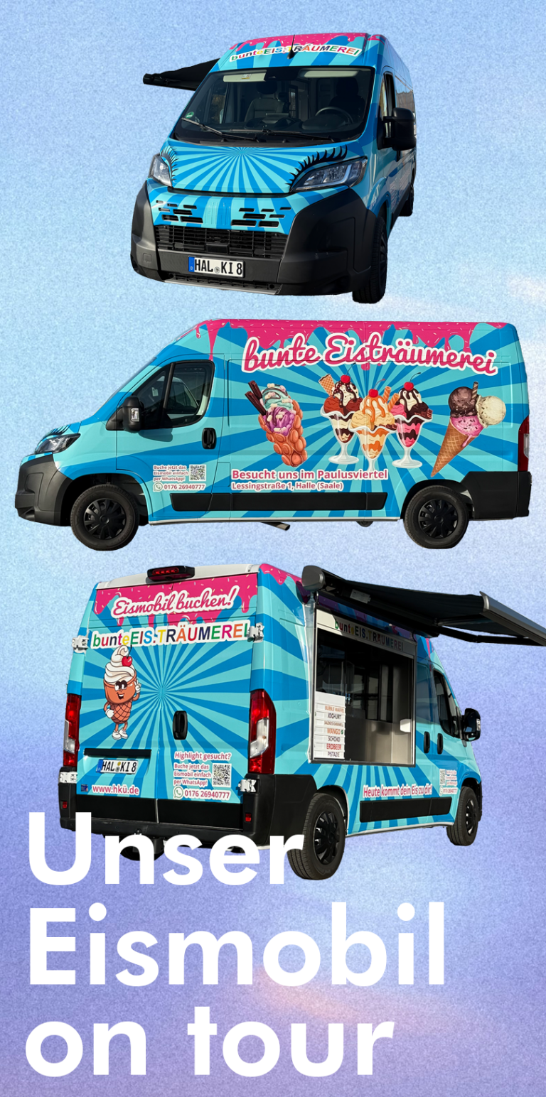 Mit dem neuen Eismobil sind mein Team und ich unterwegs für euch und buchbar für Veranstaltungen, wie etwa Firmenfeiern und Jubiläen, Hochzeiten und Geburtstage, sowie Festivals und Stadtfeste, uvm.
